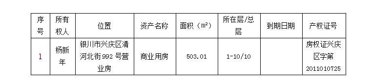 抵債資產(chǎn)為抵押人楊新年名下位于銀川市興慶區(qū)清和北街992號(hào)的營(yíng)業(yè)房,面積503.01㎡,抵押物目前處于空置狀態(tài)。