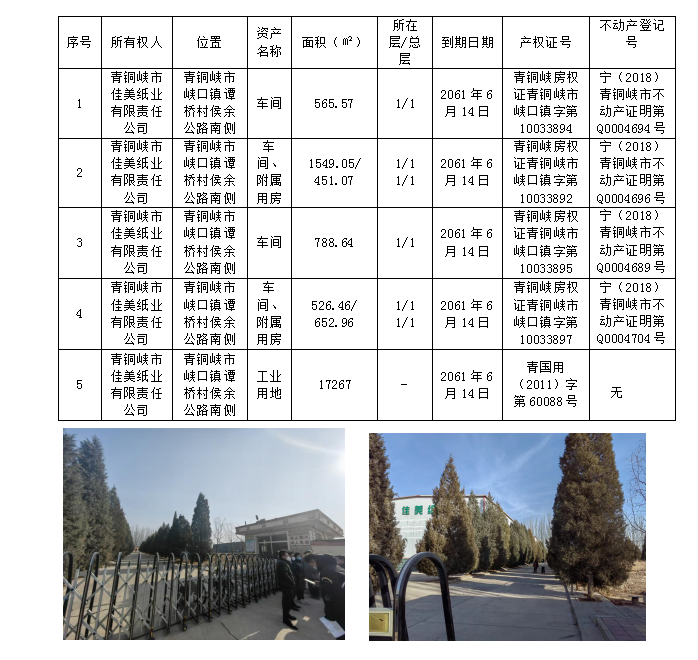 該戶債權(quán)項下位于賀蘭縣朔方南街一品尚都的抵押物,周圍商業(yè)氛圍較好,目前兩套房產(chǎn)均有承租人;青銅峽市峽口鎮(zhèn)談橋村的土地和車間位于青銅峽市峽口鎮(zhèn)譚橋村侯余公路南側(cè),即青銅峽市佳美紙業(yè)有限責(zé)任公司廠區(qū),目前因債務(wù)人資金短缺,暫時處于停產(chǎn)、關(guān)閉狀態(tài)。