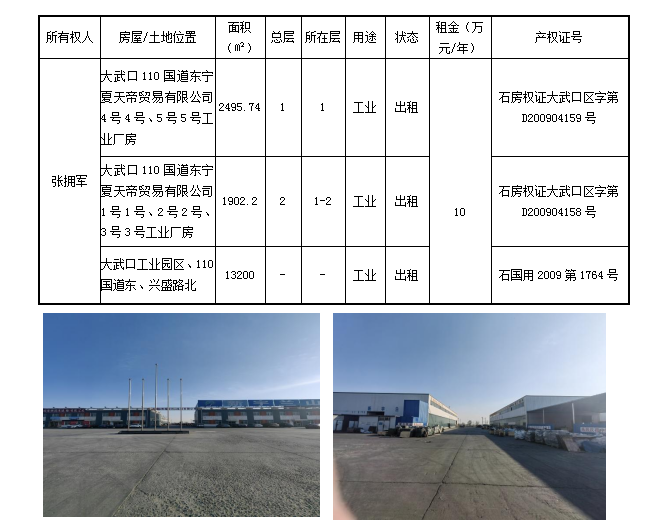 該戶債權抵押物位于110國道邊,交通便利,園區(qū)整體方正、規(guī)劃清晰,目前處于出租狀態(tài),租金10萬/年。廠區(qū)空地面積較大,可用于倉儲物流及各類輕工業(yè)生產加工。