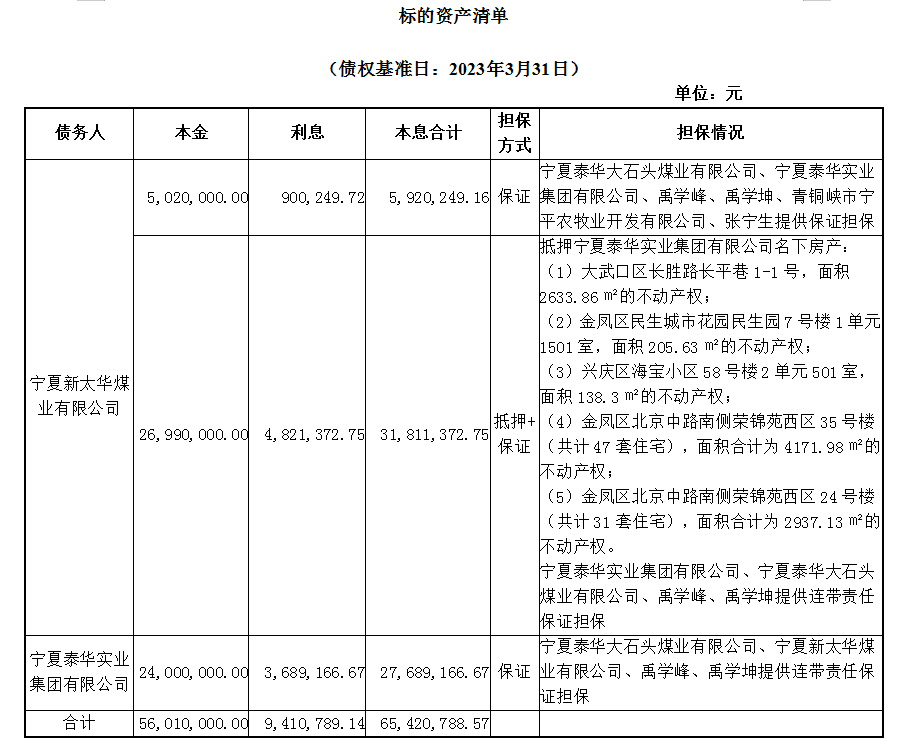 寧夏金融資產(chǎn)管理有限公司在京東資產(chǎn)競(jìng)價(jià)網(wǎng)絡(luò)平臺(tái)上以公開競(jìng)價(jià)方式轉(zhuǎn)讓寧夏新太華煤業(yè)有限公司等2戶債權(quán)資產(chǎn),截至2023年3月31日,債權(quán)本息總計(jì)6542.08萬元,其中寧夏新太華煤業(yè)有限公其中本金3201萬元,下欠利息572.17萬,寧夏泰華實(shí)業(yè)集團(tuán)有限公司其中本金2400萬元,下欠利息368.92萬元。(截至日之后產(chǎn)生的利息,以及與不良債權(quán)相關(guān)的從權(quán)利亦在本次處置范圍內(nèi))。具體債權(quán)資產(chǎn)信息詳見下表: